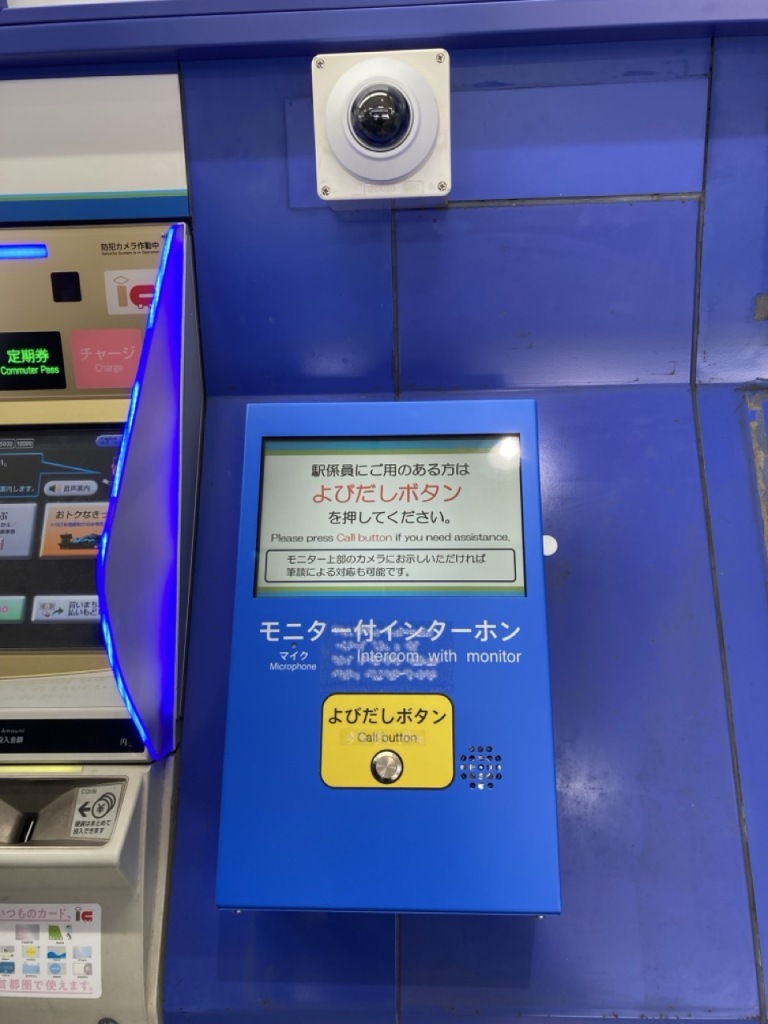 ①切符販売器の横に、新たに追加されたインターフォンボタンの在る装置です。